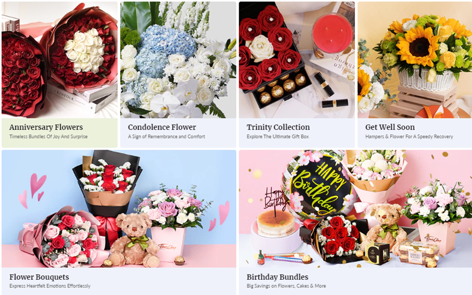 | Occasions | Birthday, Graduation, Love & Romance, Get Well Soon, and Thank You. |