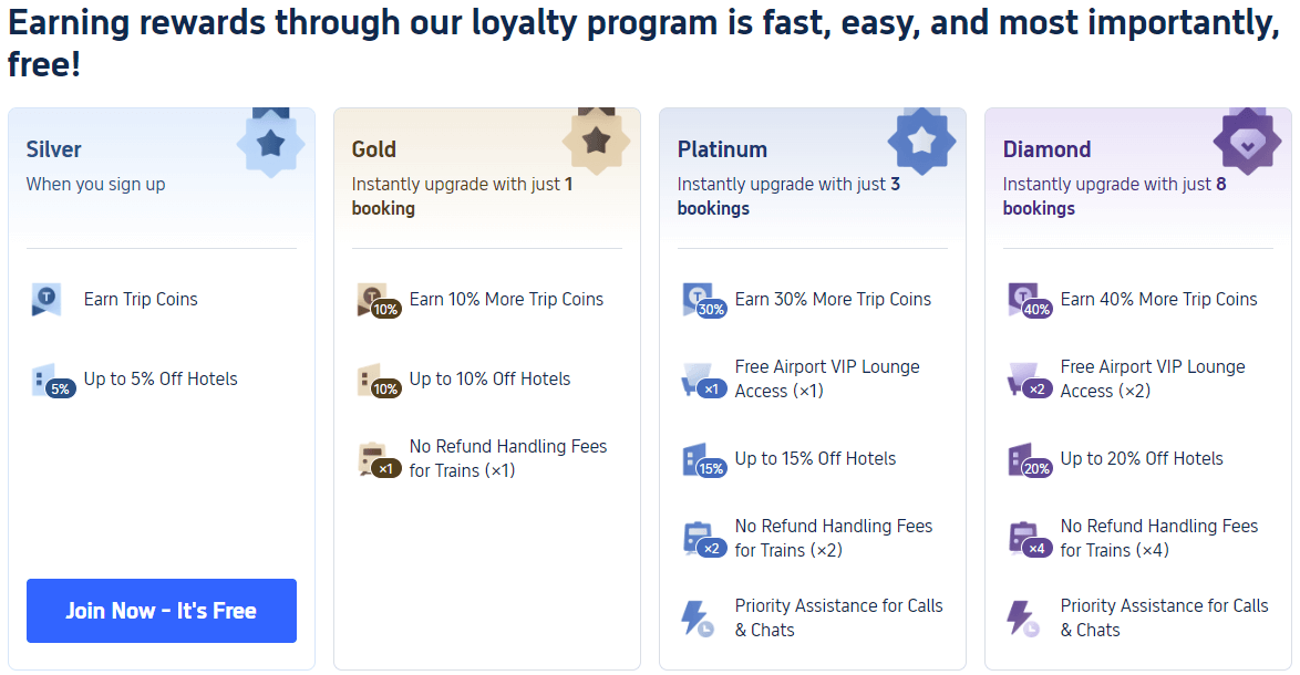 - Platinum Membership – Benefit from a 15% hotel discount and earn 30% more Trip coins.